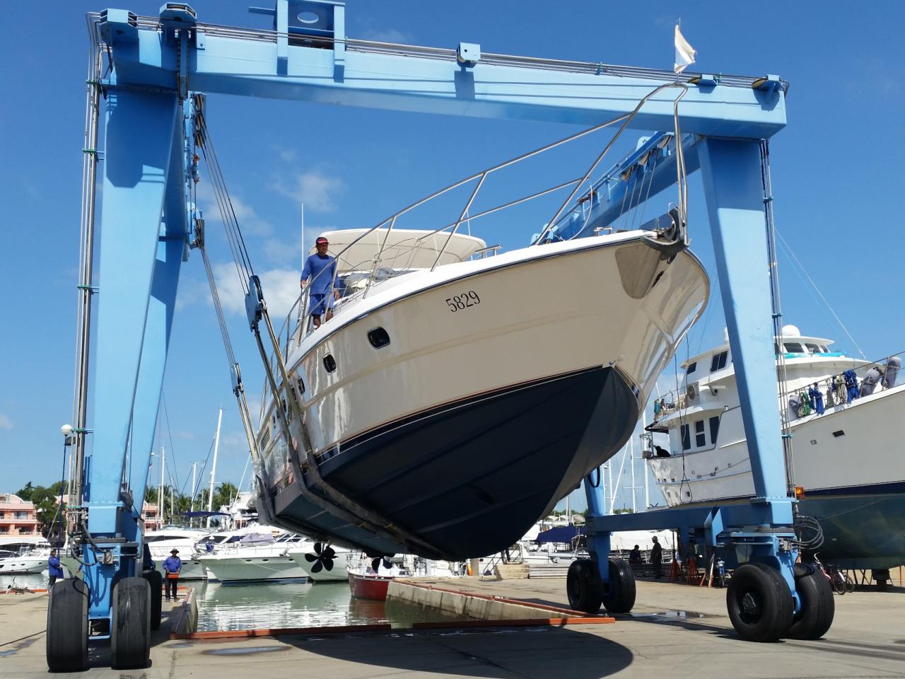 Liegt die Motoryacht ganzjährig im Süden im Wasser, muss sie zum Auffrischen des Antifouling einmal jährlich an Land. Die Propellerwelle, der Wellenbock, Propeller, Trimmklappen, Bugstrahlruder und zugewachsene Borddurchlässe sind von Muscheln zu befreien. In dieser Handarbeit stecken Arbeitsstunden und Material. Das kostet 2 x Travellift und je nach Marina auch zusätzlich zum Wasserliegeplatz den Stellplatz an Land für die Dauer der Arbeiten.