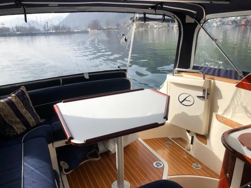Optisch überzeugt die Aquador mit ihrer tiefblauen Rumpffarbe und einer sportlich-eleganten Silhouette. Das Deck mit integrierten Teak-Applikationen unterstreicht den hochwertigen Anspruch des Bootes. Die grosszügige Badeplattform und der komfortable Cockpitbereich mit U-Sitzgruppe und Teak-Tisch laden zum Verweilen ein. Die Sitzpolster in klassischem Marineblau mit heller Kedernaht setzen stilvolle Akzente und bieten Platz für entspannte Stunden mit bis zu sieben Personen.