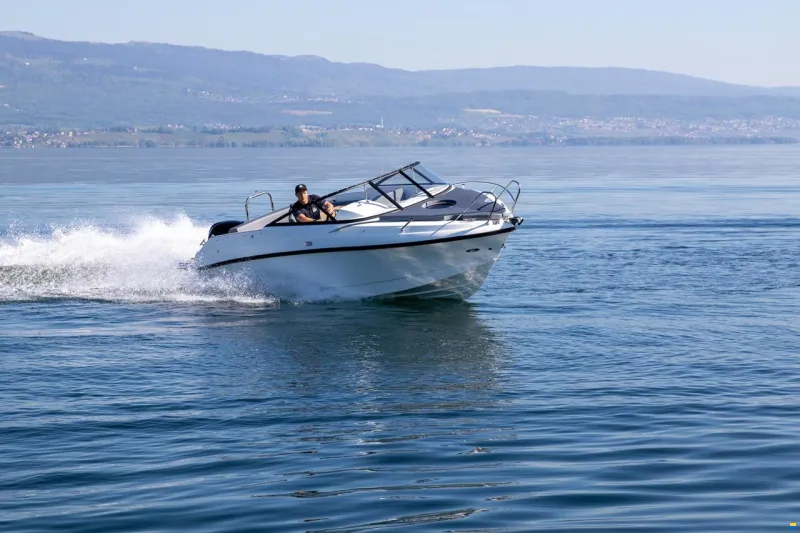 Ausgelegt für bis zu 6 Personen überzeugt der Coaster 600 DC mit einem großzügigen Cockpit, komfortablen Sonnenliegen und einer praktischen Kabine – ideal für Tagesausflüge oder längere Touren. Die Windschutzscheibe aus gehärtetem Glas mit schwarzem Rahmen sorgt für optimalen Schutz und beste Sicht.