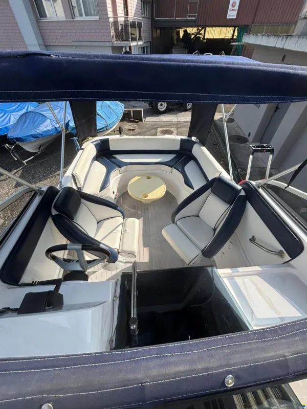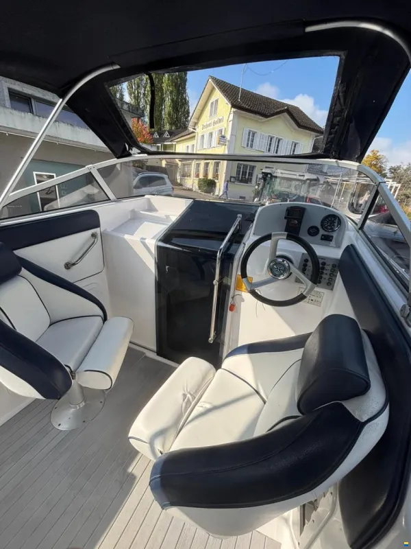 Gepflegtes Motorboot mit Torqeedo Elektromotor Cruise 4.0 RL, Ladegerät und Batterien. Mit Badeleiter, Bugliegefläche, Polster, Tisch Hafenpersenning und Fahrverdeck ohne Scheiben (kann als Sonnenverdeck gefahren werden). Das Boot wurde im Winter immer in der Halle gelagert und jährlich poliert und das Antifouling erneuert.