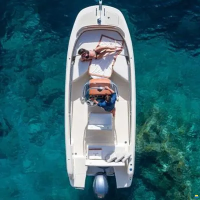Douchette de cockpit, Trompette, Coque couleur “Bianco Tropea”, Sellerie “Terracotta”, Reservoir essence 200 Lt, Pompe de cale, Lumières de navigation, Liston en acier inox, Davier avant, Bimini parasol, Boussole, Echelle de bain relevable escamotable