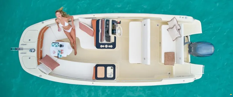 Douchette de cockpit, Trompette, Évier dans le cockpit, Coque couleur “Bianco Tropea”, Sellerie “Terracotta”, Réservoir essence 200 Lt, Pompe de cale, Lumières de navigation, Liston en acier inox, Davier avant, Bimini parasol, Echelle de bain relevable escamotable, Direction mécanique avec inclinaison, Siège transformable en bain de soleil.