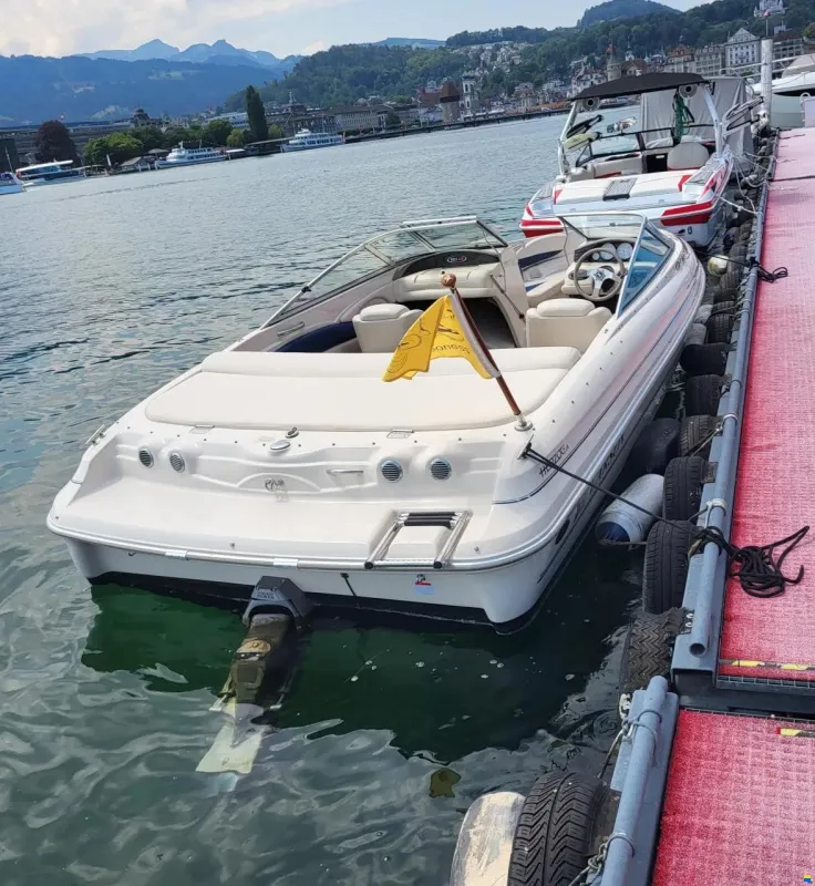 Dynamischer Bowrider mit genialen Fahreigenschaften, Cockpit mit Fahrer- und Beifahrersitz, U-Heckbank mit Füllerkissen, Bug mit Sitzgelegenheit, viele Staufächer, Badeplafform mit Badeleiter, Cabrioverdeck komplett, Anchor Shade, Ganzpersenning Swiss, Antifouling und viele Gadgets mehr, feel the difference!