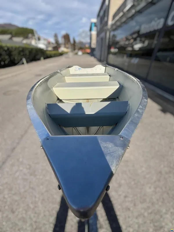 Farbe: Hempel Light Grey Primer, 2 Ruderhalterungen, Ablassstopfen am Heck, Bugöse, Bänke mit Kreuznieten, Aluminium-Verstärkungsplatte am Querträger, abgerundete Bug- und Heckecke zur Erleichterung des Bootstransports, 2x Griffe am Querträger.