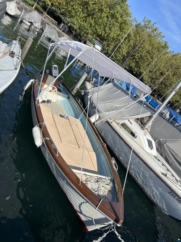 Tolles Badeboot in einem schönen Holz-Design. Eingewassert im Zürichsee (Hafen Riesbach). Ohne Trailer. Diverse Staumöglichkeiten. Mit Bimini-Sonnenschutz. Neue Ganzpersenning. Inkl. div. Zubehör wie Schwimmwesten, Ruder etc. Es ist kein Bootsführerschein nötig. Ab Schifffahrtskontrolle Frühling 2026.