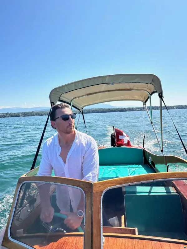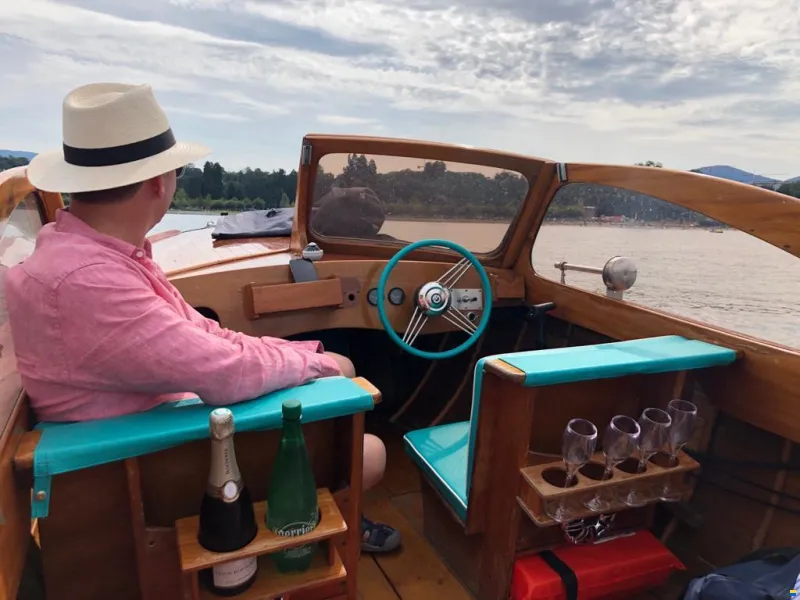 Vollständig restauriertes, handgefertigtes Holzschnellboot in hervorragendem Zustand, das in Genf liegt. Im Sommer liegt es im Wasser (Liegeplatz), wird jeden Winter aus dem See gehoben und am Ufer in der Nähe des Liegeplatzes gelagert. Eine einzigartige Kombination aus klassischer Mahagoni-Eleganz und moderner Zuverlässigkeit, perfekt zum Kreuzen, Wasserskifahren oder Genießen auf dem See.