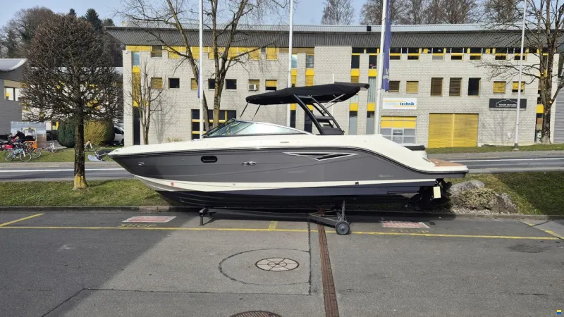 Captain’s Package mit folgenden Optionen: Cockpitdecke, Bugdecke, Cockpitdusche Heck, Anlegescheinwerfer 2x, Scheibenwischer STB, Cockpittisch Teak rund, Elevations Package mit folgenden Optionen: Wassersport- Tower mit Bimini Top, Wakeboard Racks (2x), Rückspiegel, Luftkompressor für Wasserspielzeuge, Bimini Verdeckpaket, Füllkissen für Bug, Tisch für Bug Teak, Sonnenschutz im Bug, Cockpittisch klappbar Teak mit Liegepolster, Cockpitboden mit Teakholz, Badeplattform mit Teakholz, Cockpitkühlfach 12V, Fender Clips 6x, Cockpitbeleuchtung LED blau, Unterwasserbeleuchtung an Schale 2x blau, Dual Digital Dash Simrad 12 Zoll GO12 Touchscreen Displays, Navigationskarte Navionics Alpine Lakes & Rivers, Transducer/Tiefenmesser und Wassertemperaturanzeige, Bug-Launcher mit abklappbaren Armlehnen, Getränkehalter aus Edelstahl (10x), Edelstahl-Badeleiter mit vier Stufen und integrierten Haltegriffen (2x), Steckdosen für Zubehör (zwei 12-Volt; eine USB-Doppelbuchse), Mercury VesselView® Mobile, Stereoanlage Premium: Fusion® Apollo RA770 12V AM/FM, NRX 300 Transom Remote, Signature Series Amplifiers 2, Signature Series Speakers (6.5 Zoll) 6x, Signature Series Subwoofer (10 Zoll), Batteriewahlschalter mit Zusatzbatterie, Yachttoilette mit elektrische Spülung, Tank und Absaugsystem über Bord, Dynamic Running Surface™ - DRS (Trim Tabs, die automatisch die Lage und den Trimm optimieren), Schalt- und Gashebel – SmartCraft® Digital Throttle & Shift (DTS) mit Trimm-Schalter und Zündsperrschalter, Mercury Active Trim (geschwindigkeitsbasiertes automatisches Mototrimmsystem mit integriertem GPS), Unterwasserplattform manuell absenkbar, Ankerwinde 12V, Kette, Anker Chromstahl, Bugstrahler, Hafendecke Stamoid Farbe hellgrau, Unterwasseranstrich (5x Grundiert VC Tar, 2 x Thin film Swiss) – anthrazit, Frisch ab Service (Motor und Z-Drive), Feuerlöschsysteme frisch geprüft, Frisch ab MFK (22.07.2025), Boot in absolutem top Zustand, Vollausstattung.