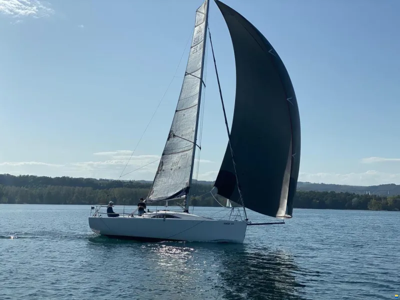 Sehr schnelles Boot mit umfangreicher Segelgarderobe (Gross und Fock Jahrgang 2023, 3 Genaker, Topgenua, Code-0, Sturmfock). Kiel mit Torpedo und Tiefgang von 1.90 m sowie einem verlängerten Ruder, damit sehr stabil auch bei grosser Segellast gut handelbar.