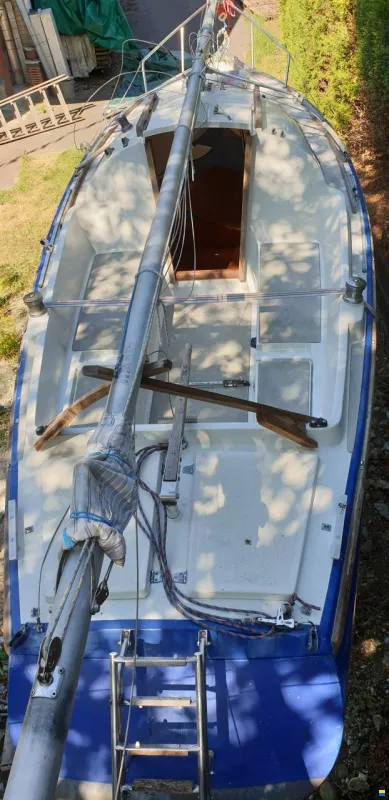 Das Boot liegt jetzt schon länger an Land unter einer Plane, der Gesamtzustand ist eher schlecht, es gibt einige Gelcoat Beschädigungen, das Deck ist nicht komplett wasserdicht. Die Ruder Unterseite müsste neu verschlossen werden. Auf der Steuerbordseite wurden Pütting Verankerungen nicht sauber ausgeführt.