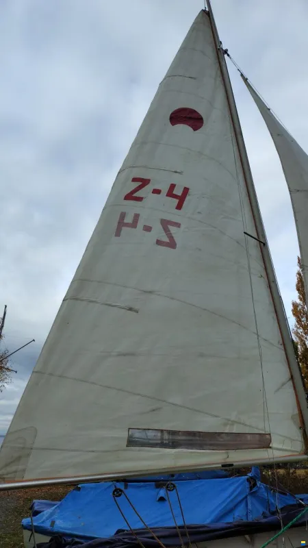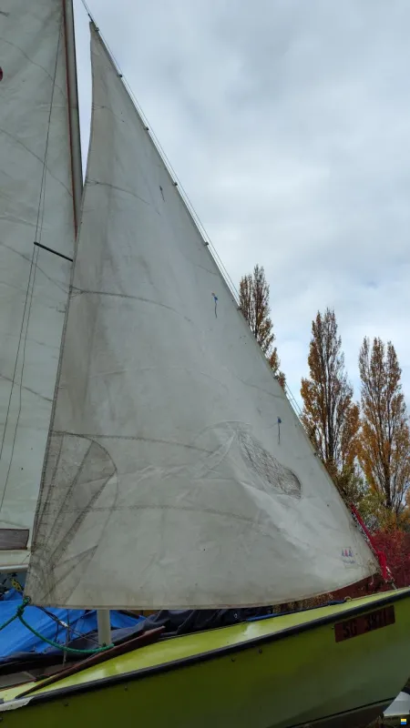 Die Jolle ist zwar Segelbereit, aber auch in die Jahre gekommen und braucht ein wenig Zuwendung. Speziell die obere Holzabdeckung des Kielkasten löst sich auf und muss erneuert werden. Der Trailer hat keine Strassenzulassung und bräuchte vorher auch ein wenig Zuwendung ist aber auf dem Hafengelände brauchbar.