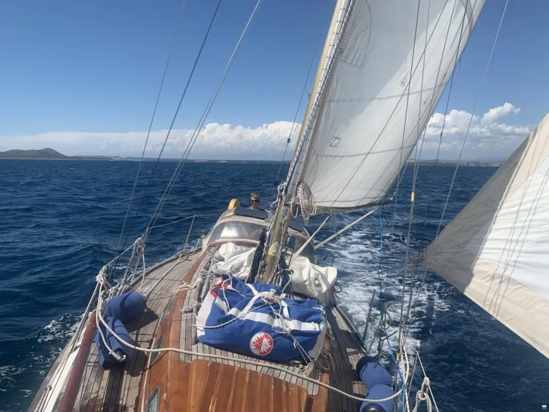 Die Vindö 40 ist ein schwedisches Design und wurde bei Nötesunds Varv auf Orust gebaut, dem Vorläufer der bekannten Hallberg-Rassy-Werft. Viele Merkmale stimmen daher überein. So verfügt das Boot beispielsweise über eine robuste Konstruktion, die zu seiner Haltbarkeit und Seetüchtigkeit beiträgt. Das Boot segelt daher sehr zuverlässig, auch wenn die Bedingungen härter werden. Aufkreuzen bis 40 kts Wind ist überhaupt kein Problem. Sturmfock welches an einem seperaten Stag geführt wird und Spinacker sind auch dabei. Dadurch ist das Boot für lange Reisen und Hochseesegeln geeignet. Mit seinen lackierten Holzaufbauten, dem weißen Rumpf und dem Teakdeck hat es ein charmantes und zeitloses Aussehen und ist in jedem Hafen ein Hingucker. Obwohl man dem Deck die Jahre der Erfahrung ansieht, ist es dicht. Das Boot eignet sich perfekt für Neueinsteiger die ein günstiges Segelboot haben möchten welches gute Segeleigenschaften hat.