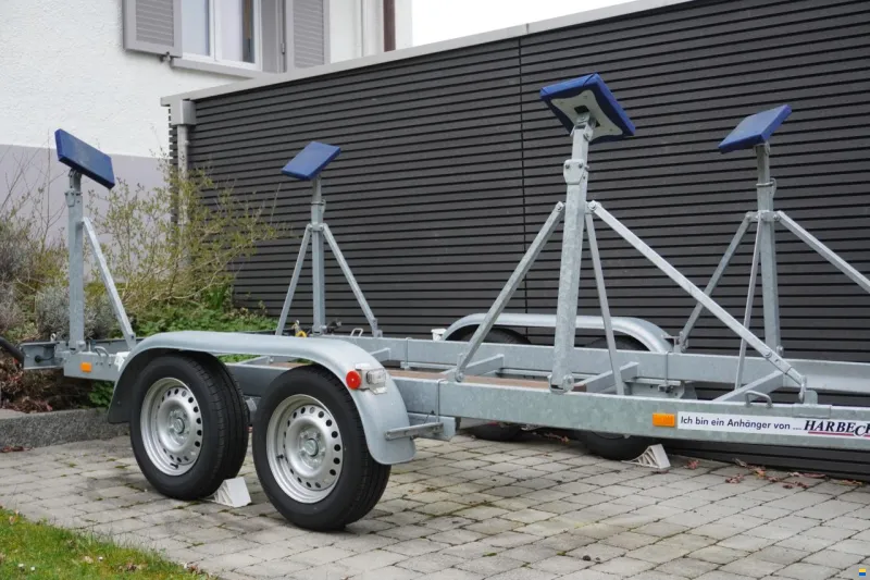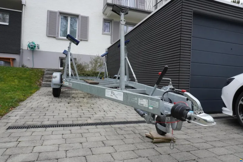 Fahrgestellrahmen V-förmig in Schweisskonstruktion gefertigt, wassergeschützte/wasserdichte Radnaben, 100km/h-fähig, Rückfahrautomatik, tiefgebogene Quertraversen, Kugelkupplung, Kielbrett, 4 gepolsterte Auflagen mit Kreuzgelenken, Stützrad, ausziehbare Lichtleiste mit Mehrkammerleuchten 12Volt, Elektrostecker 13-polig, Stützenhöhe 1.20m, Nutzlast 1'770kg,